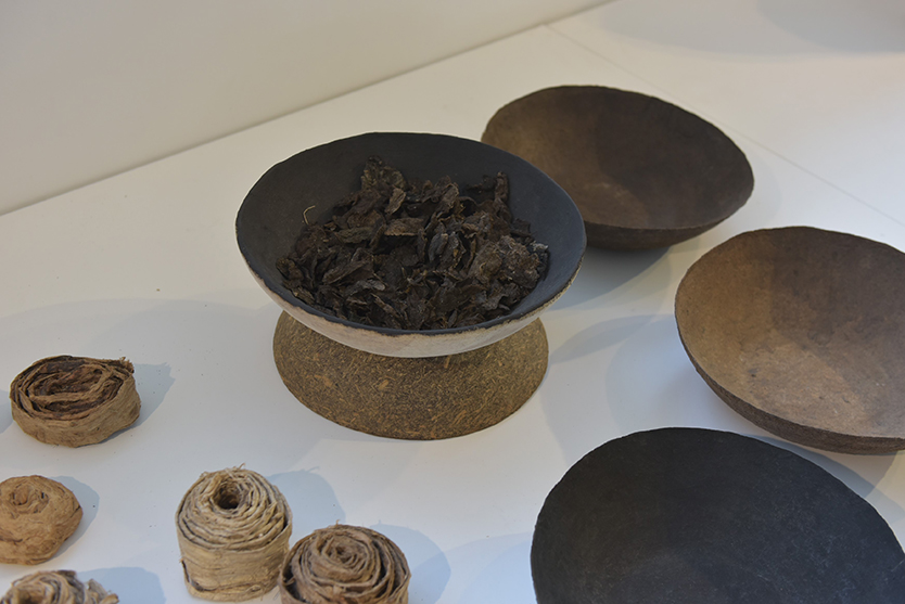 <종이 항아리>는 오랫동안 식재 한 닥나무로 종이를 만들고 부착조류(녹조)를 섞어 재료의 물성을 접합한 결과이다. 사회현상을 들여다보며 발견하게 된 녹조라는 소재는 닥나무와 결합하여 전통과 현대를 넘어서는 여정의 작업을 선보인다.