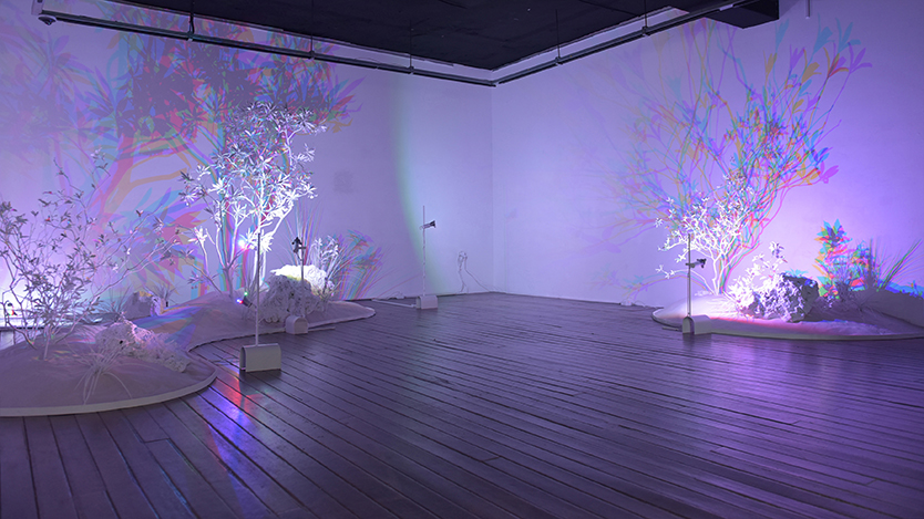 리드아트, 수무, 휴 키이스의 <매화점장단>은 재구성한 장구 리듬과 자연에서 수집한 소리로 이루어진 음악, 물의 파동에 따라 움직이는 빛, 색이 제거되고 형태만 남은 식물로 구성된 공간 설치 작업이다.