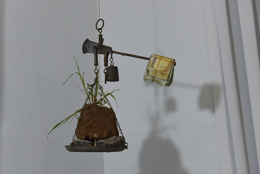 작가는 인간사의 이면이나 사회, 문화, 환경적 단면에 대한 근원적 질문을 끊임없이 이어가며 작품세계를 구축하고 있다. 돈과 저울질 당하는 땅, 국가와 지역을 가리지 않고 거래되고 있는 땅, 낮은 곳에 위치하고 있는 땅과 점점 하늘 높이 올라가고 있는 땅, 그리고 조각조각 잘라지고 나누어지는 땅 등을 금각리의 흙과 자라나는 풀을 재료로 자본주의 시대를 살아가는 현대인들이 땅을 소비하는 현실을 명료하게 드러낸다.