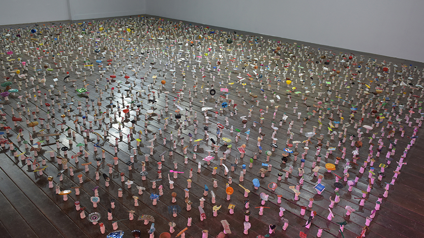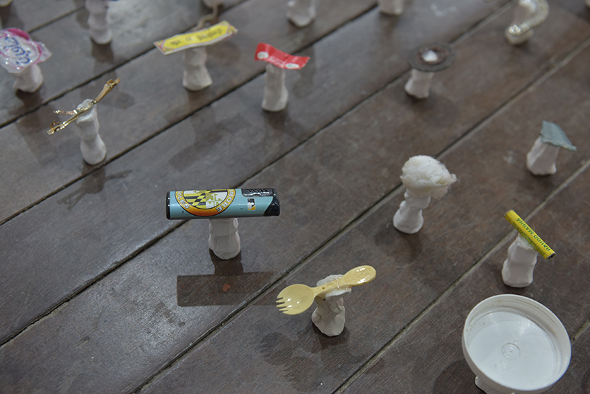 <줍/픽>은 우리나라, 중남미, 아프리카, 유럽, 인도 등 세계 곳곳의 동시대 삶의 현장에 머물며 8년간 수집한 쓰레기 오브제 1만여 점 중 3,000개를 흰색 점토 받침에 접착한 설치 작품이다.