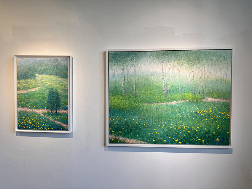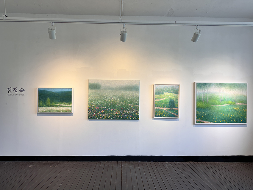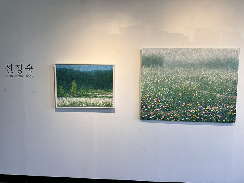 전정숙의 <속삭임 Whispering-존재가치에 대한 인식>은 유년시절을 다채롭게 만들어준 자연에 대한 고마움과 우연히 여행길에서 마주한 작지만 생명력이 느껴졌던 들꽃들을 담아낸다. 물감의 반복적인 건조과정과 색채의 조화를 맞추는 인내의 작업을 통해 관람객에게 위로와 희망의 메시지를 던진다.
