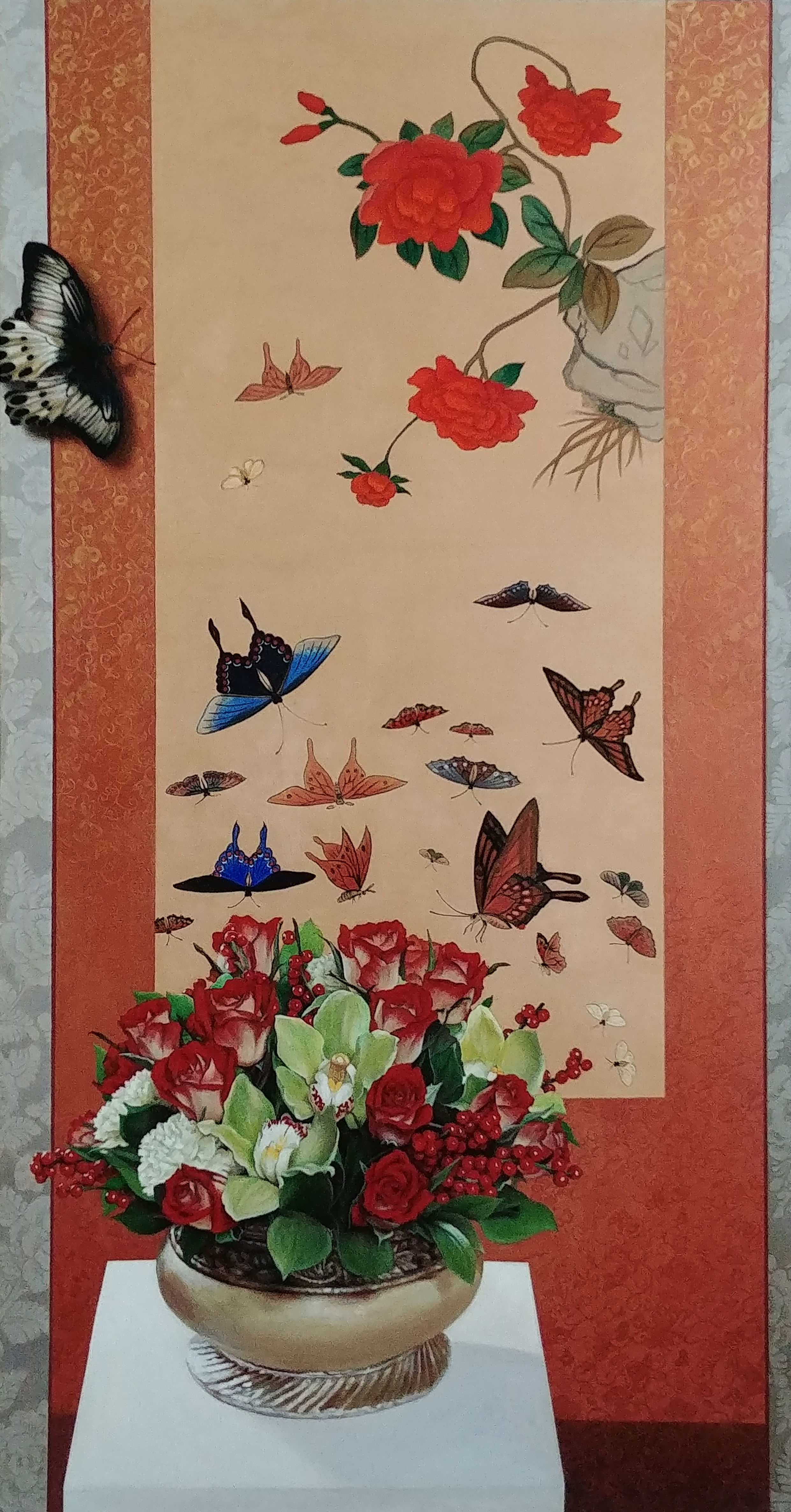 정환선의 작품 속 2차원으로 표현되는 민화와, 3차원으로 묘사되는 현실 공간은 과거, 현재와 같은 시간대의 공간을 뜻하기도 하고, 동양적 공간과 서구화된 공간을 뜻하기도 한다. 이러한 공존은 지금 우리가 살아가는 동,서,고,금 그리고 다국적 감각까지 혼입된 총체적 세상을 보는 듯 하다.